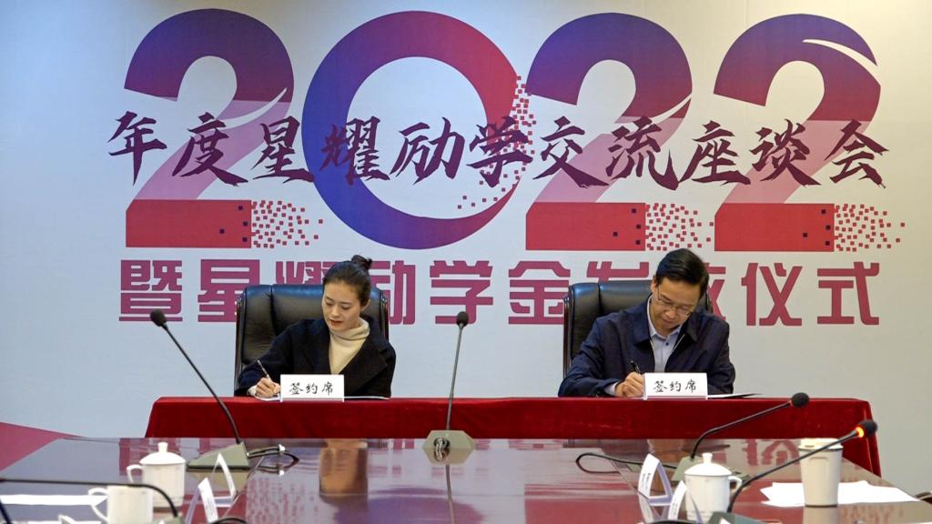 最后,双方领导签署星耀二期励学金捐赠协议书,并为受助学生颁发励学金证书。根据协议,本期共捐助20名大一新生,最高提供学费4500元/人/年,住宿费800元/人/年,生活费900元/人/月(按3年、每年10个月计算),捐赠款项共计964000元。