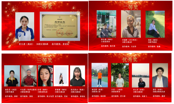 受新冠疫情影响,比赛采用录制演讲视频的评选方式进行,演讲题目为《我的中国梦》。经班级初选,有来自泰国、缅甸、越南、尼日利亚、哈萨克斯坦五个国家的13名选手进入决赛。在指导老师的帮助下,参赛选手认真备赛,以流利的汉语表达、娴熟的演讲技巧以及对汉语和中国文化的深刻理解,展现了他们留学中国的学习成果。比赛评选出一等奖1名、二等奖3名、三等奖5名及优秀奖4名。