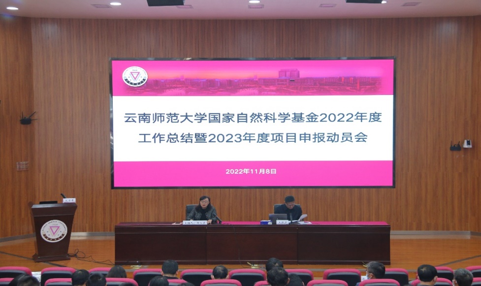 11月8日,永利官网国家自然科学基金2022年度工作总结暨2023年项目申报动员会在呈贡主校区汇学2幢报告厅召开。校长王德强、副校长郝淑美,相关职能部门主要负责人,各理科学院书记、院长、分管科研工作负责人、科研秘书,相关文科学院分管科研工作负责人、科研秘书,省级以上自然科学科研平台负责人,科研骨干教师及新进青年博士等150余人参加了本次会议。会议由郝淑美主持。