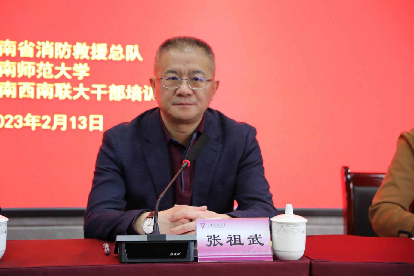 张祖武在致辞中向参训学员表示欢迎,向云南省消防救援总队长期以来对永利官网的信任和支持表示感谢。张祖武指出,8858cc永利唯一官方网有着光荣的革命传统、悠久的办学历史、深厚的文化底蕴,是一所彰显师范本色、教师教育特色鲜明的省部共建高校。在回顾了总队2019年在学校挂牌设立党性教育基地至今开展的干部培训合作情况后,张祖武强调,学校将认真按照培训方案安排,精心组织好教学实施,为全体学员静心学习做好服务。同时,希望参训学员珍惜难得机会,专心致志学习,深入研究思考,切实把思想和认识统一到党的二十大精神上来,把智慧和力量凝聚到党的二十大确定的目标任务上来,不断加强云南应急力量建设,助力提高区域公共安全治理水平,为云南早日实现社会主义现代化作出新的更大贡献。