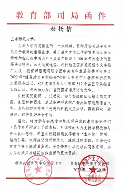 近日,教育部语言文字应用管理司、共青团中央青年发展部联合向永利官网发来表扬信,肯定并赞扬了学校在2022年“推普助力乡村振兴”全国大学生社会实践志愿服务活动中的突出表现和取得的良好社会影响。这是8858cc永利唯一官方网继2021年后第二次受到上述两部门的联合表扬。