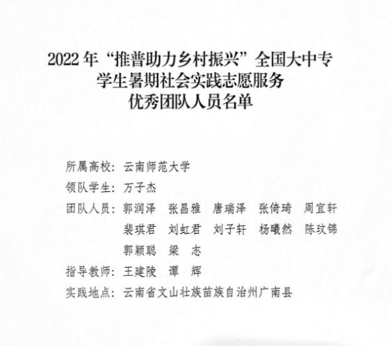 根据教育部语言文字运用管理司、团中央青年发展部《关于开展2022年全国大中专学生志愿者暑期文化科技卫生“三下乡”社会实践活动的通知》要求,学校高度重视教务处、校团委、传媒学院、学校国家语言文字推广基地,广泛动员,组建由传媒学院王建陵、谭辉老师担任指导教师,万子杰等13名播音主持专业和新闻与传播专业学生组成志愿团队,于2022年7月9日至18日赴文山州广南县村镇社区开展“推普助力乡村振兴”暑期社会实践志愿服务活动。