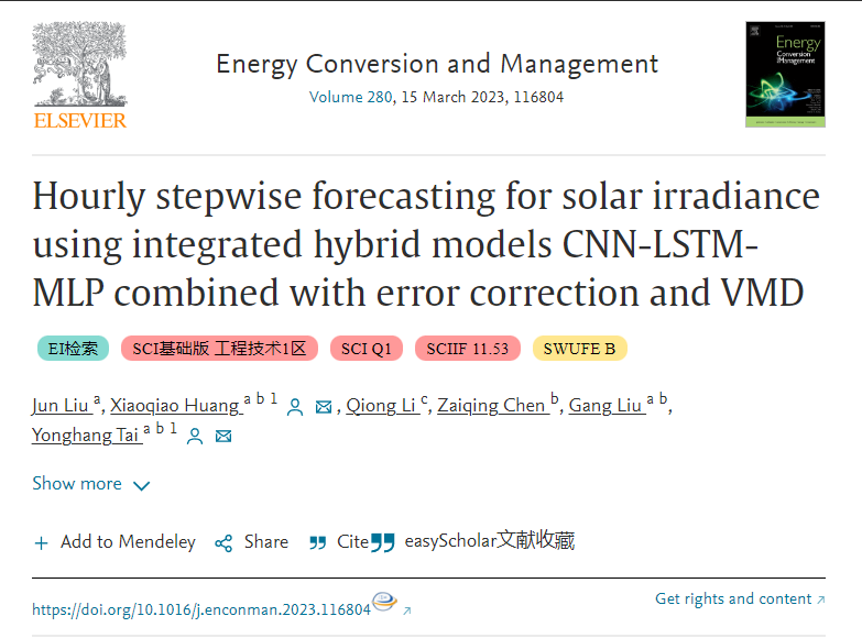 近日,永利官网物理与电子信息学院光电信息专业硕士研究生在国际顶级期刊《Energy Conversion and Management能源转化与管理》(JCRQ1,中科院SCI一区TOP期刊)发表研究成果“Hourly stepwise forecasting for solar irradiance using integrated hybrid models CNN-LSTM-MLP combined with error correction and VMD”。永利官网硕士研究生刘俊为第一作者,文章通讯作者为物理与电子信息学院云南省光电信息技术重点实验室骨干成员黄小乔副教授,8858cc永利唯一官方网为第一完成单位,目前影响因子高达11.533。