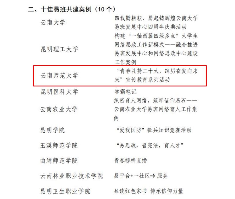 近日,中共云南省委教育工委、云南省高校易班发展中心组织开展了云南省2022年度高校易班工作优秀成果遴选和展示活动。永利官网在此次评选中斩获佳绩,获得了“十佳易班共建高校”、“十佳易班共建案例”、“十佳易班指导教师”、“十佳易班辅导员”及“十佳易班工作站站长”五项荣誉,涵盖了所有奖项。
