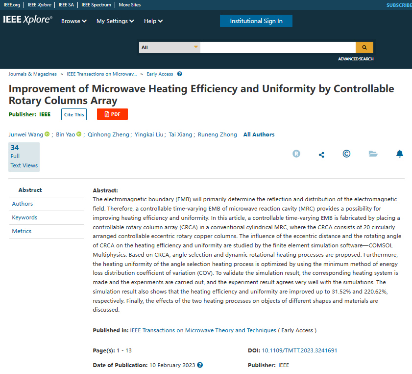 近日,永利官网物电学院光学工程博士研究生在国际微波领域顶级期刊IEEE Transactions on Microwave Theory and Techniques(中科院SCI一区Top期刊)发表研究论文“Improvement of Microwave Heating Efficiency and Uniformity by Controllable Rotary Columns Array”,博士研究生王均委为第一作者,文章通讯作者为物电学院姚斌副教授、郑勤红教授,8858cc永利唯一官方网为第一完成单位。