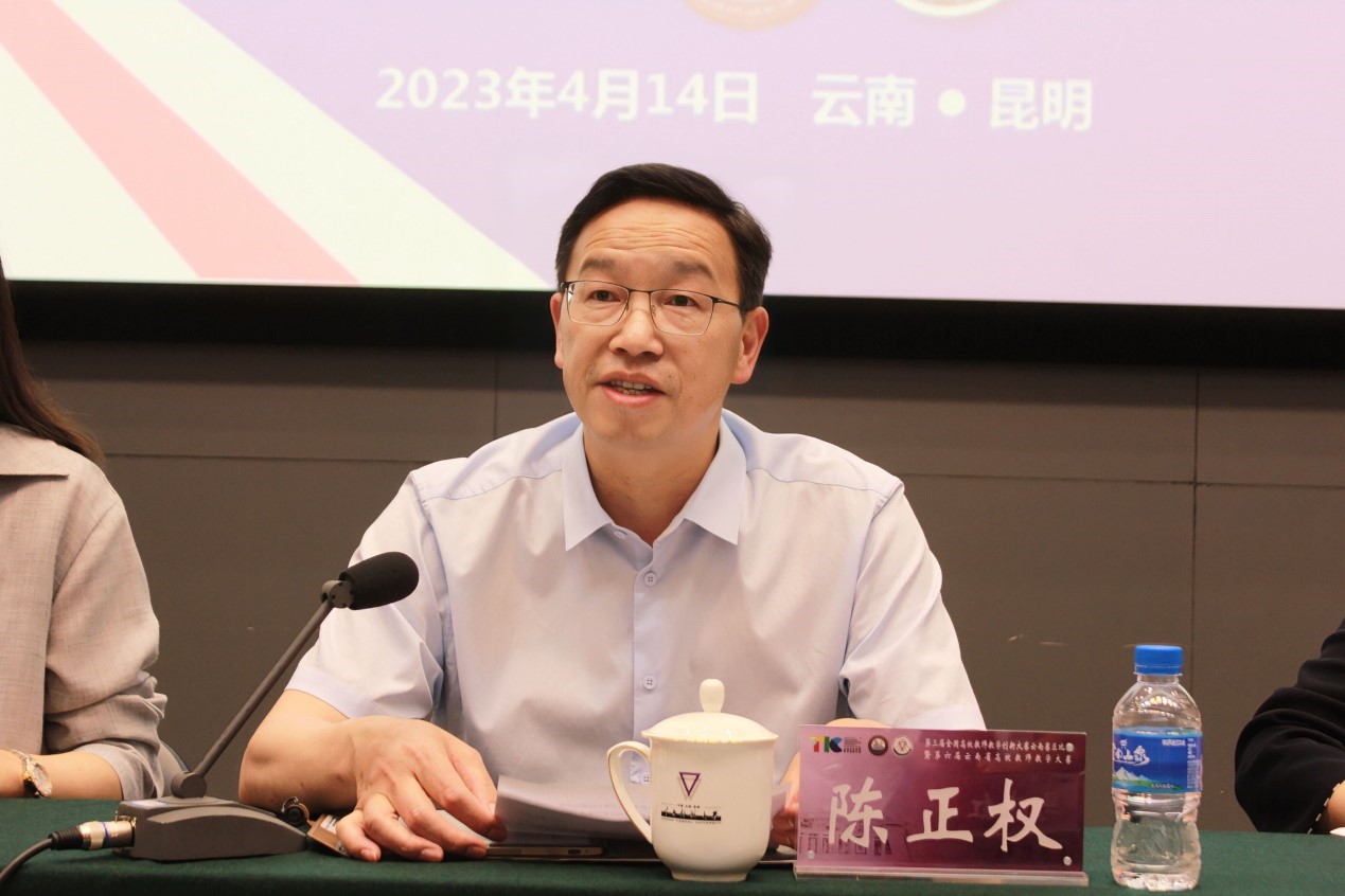 陈正权代表学校对获奖教师表示祝贺,对省教育厅及各兄弟院校长期以来关心支持学校建设发展表示感谢。他指出,本届教学大赛着眼于“以赛促教、以赛促学、以赛促改、以赛促建”原则,在引导广大教师提高教育教学能力,夯实教育教学基本功,推进教育教学改革,顺应智慧教育变革,凸显本科教学中心地位,为云南高等教育打造高水平人才队伍方面发挥了积极作用。他表示,通过比赛,来自全省本科院校的69名教师同台竞技,展示了良好的精神面貌、精湛的教学能力,切磋了技艺,交流了经验,开拓了视野,体现了广大教师对教学质量的不懈追求和对教育理想的默默坚守。