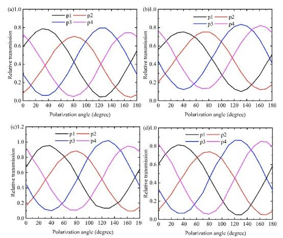 图1 用于探测四个线偏振光(0°、45°、90°、135°)的片上集成中波红外探测器的光学超表面SEM图(左),上述超结构在波长 3.5 µm、4.0 µm、4.5 µm和 5.0 µm时的透过率随偏振角度变化趋势(右)。