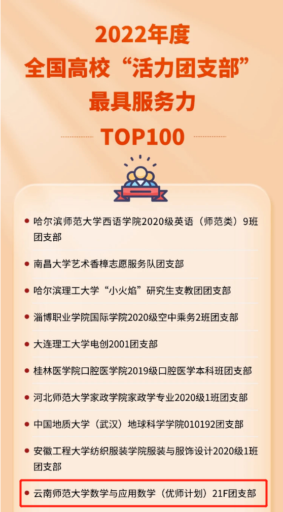 4月20日,在团中央基层建设部指导下,中国青年报社公布了“活力团支部炼成记”2022年度高校“活力团支部”风采展示活动。活动通过新媒体方式集中展现高校团支部在引领力、组织力、服务力、贡献度、改革味、好作风6个方面的改革建设成果和典型经验。经过校内选树、校级展示、省级展示、全国展示等环节,形成《2022年度全国高校“活力团支部”最具服务力TOP100榜》,永利官网数学学院数学与应用数学(优师计划)2021级F班上榜,获评2022年度全国高校“活力团支部”最具服务力TOP10。