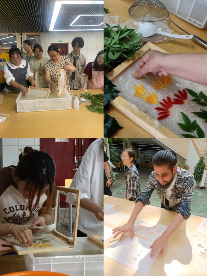 云南民族博物馆副研究馆员吴松懿以“浅谈云南传统造纸术”为题,讲述了造纸术的历史、宣纸的制作工艺以及云南少数民族如纳西族、傣族的造纸方法,增进了大家对造纸工艺的理性认识。讲座之后,兴致盎然的师生们在专家的指导下亲自体验古法造纸技艺。先在准备好的纸浆里抄纸,然后用各类鲜花、绿叶在纸上摆出自己喜欢的形状,最后再浇上纸浆,晒干,揭纸,一张美丽、独特又有个性的花草纸便完成了。来自华文学院的留学生也来到现场参加活动,师生们纷纷表示十分喜爱这次活动,期待图书馆举办更多的文化体验活动。