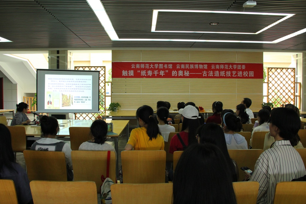造纸术是人类文明史上的一项伟大发明,推动了人类书写材料的变革,这是中华民族对世界做出的卓越贡献,是中国人引以为傲的科学成就,其中蕴涵的古人智慧与科学精神是激发创新思维的力量源泉,值得我们代代相传。传统手工纸因有严苛的制作工艺,成纸易于保存、经久不腐,故有“纸寿千年”之说。为了让永利官网师生近距离接触造纸这一古老技艺,图书馆特别邀请了云南民族博物馆的专家走进校园,带大家通过一堂非遗技艺课,一起探索“纸寿千年”的奥秘。