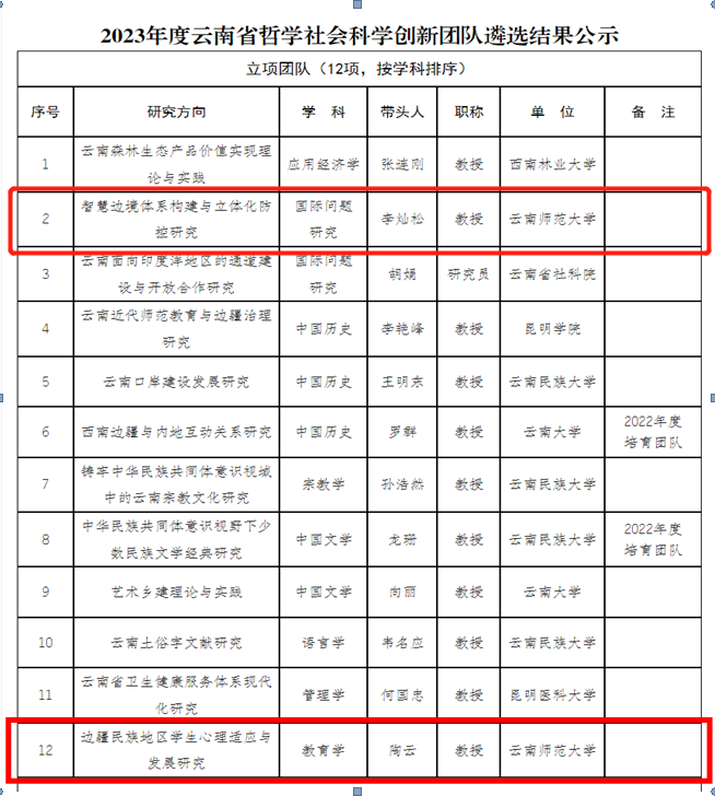 近日,根据《2023年度云南省哲学社会科学创新团队遴选结果公示》,8858cc永利唯一官方网陶云教授“边疆民族地区学生心理适应与发展研究”团队与李灿松教授“智慧边境体系构建与立体化防控研究”团队获得2023年度“云南省哲学社会科学创新团队”立项。