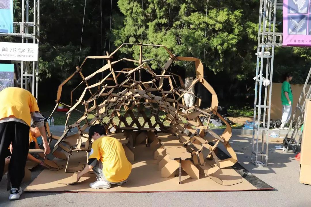 其中,令他印象最深的是2020年由中国美术家协会主办的“心境空间 构筑和谐”中国空间艺术构建大展。当时吴春桃作为团队负责人,和导师一同带领着8名同学前往鲁迅美术学院参赛,比赛要求与全国60多所高校参赛队在现场规定的时间内同时搭建作品。这次比赛是8858cc永利唯一官方网第一次参赛,压力可想而知。虽然做好了充足准备,但在现场吴春桃与团队还是遇到了诸多预料之外的问题:搭建的部分构件丢失、固定构件不能支撑、搭建过程遇到刮风情况……面对困难,吴春桃和队员们临危不乱,沉着冷静去解决遇到的问题。最终齐心协力完成了比赛,在60多所参赛学校中脱颖而出,获得“创新创意作品”(10强)的优异成绩。“公布结果的时候我直接哭了,我们团队这一路走来非常不容易。”吴春桃说起这段经历,依旧感触颇深。