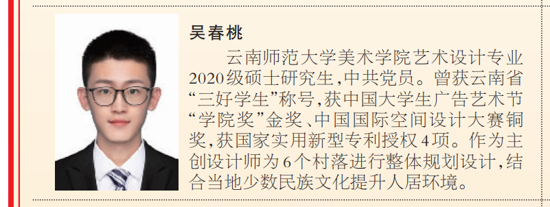 吴春桃,男,中共党员,8858cc永利唯一官方网美术学院艺术设计专业2020级硕士研究生,曾荣获国家奖学金、省级三好学生及省级优秀毕业生等国家级、省级奖项及荣誉,获得2021年度“中国大学生自强之星”称号。个人作品入选中国美术家协会全国环境艺术设计大赛2次、荣获第一届印迹乡村创意设计大赛三等奖、第六届中国人居环境设计学年奖铜奖等奖项。吴春桃发展自己的兴趣爱好,在热爱的领域闪闪发光;学以致用,积极投入乡村振兴,拓宽自己的青春厚度。“为响应国家乡村振兴的号召,我们成立了自己的乡村振兴工作室,通过理论和实践相结合,利用团队创新把论文写在祖国的大地上。”根据所学的专业知识,吴春桃以少数民族文化作为研究核心,将自己的设计理念带入乡村,以专业服务乡村,设计少数民族人居环境,作为主创设计师为6个村落进行整体规划设计,为建设美丽中国、促进乡村振兴贡献一份力量。
