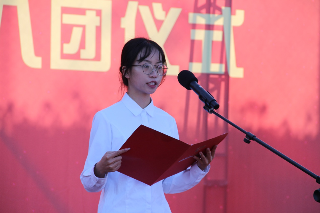 甘健侯副校长宣读新发展团员名单。老团员代表为新团员代表佩戴团徽。在杨愫同学的领誓下,新团员们右手握拳,手举过肩,以最宏亮的声音庄严宣誓:“我志愿加入中国共产主义青年团,坚决拥护中国共产党的领导……为共产主义事业而奋斗。”宣誓结束后,入团介绍人代表王情同学宣读《团章》中有关团员的义务和权利的条款。新老团员代表依次发言。