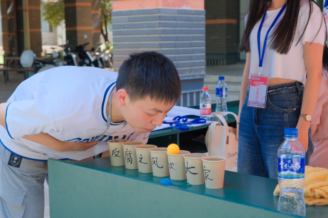 活动现场共设置3个游戏环节:一是“勤廉谜语大家猜”,以猜谜语的形式让同学们更好地了解廉洁的内涵和重要性;二是“吹清风球”,同学们需逐一吹动乒乓球,穿过贴有“反腐之风大家吹”字样的水杯,以此寓意大家齐心协力吹反腐风;三是“反腐投箭”,每位同学有八支箭矢,需将箭矢投入到一旁贴有多张反腐标语的木盒中,以此警醒党员、团员青年贪腐行为不能有。