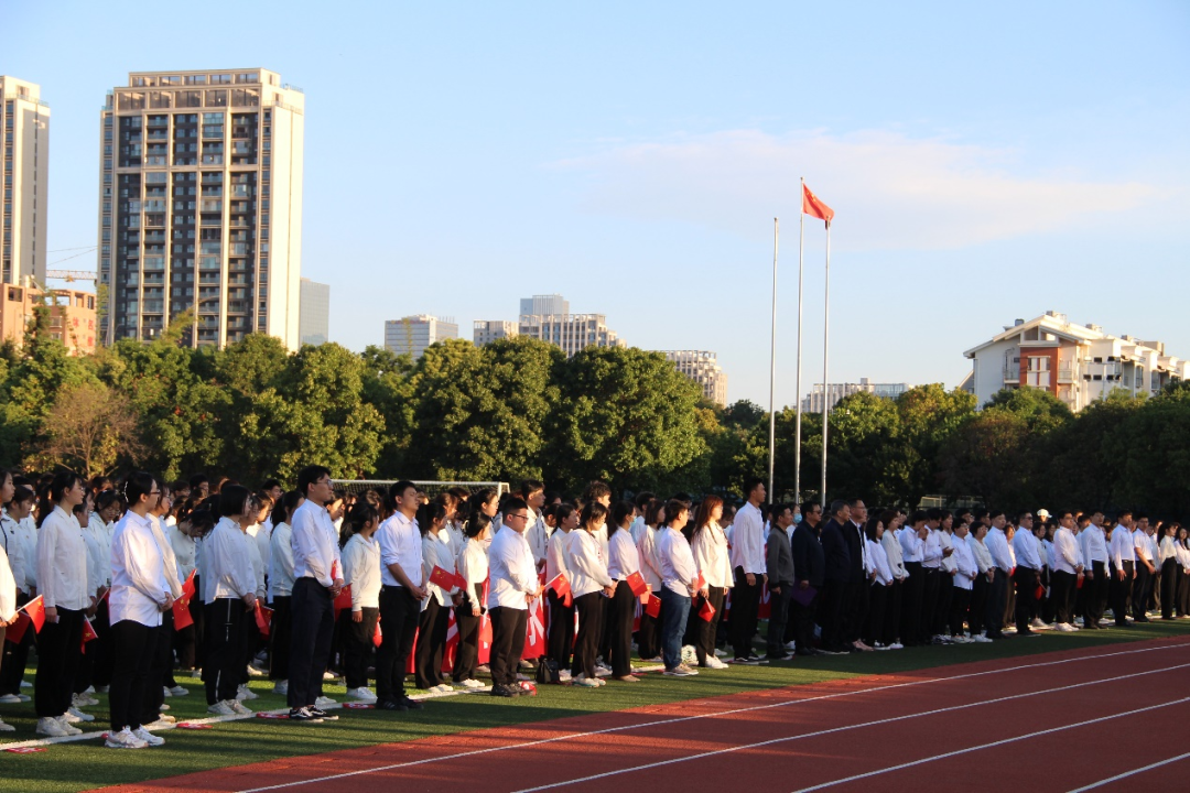 早上7点升旗仪式正式开始。在参会师生的注目礼下,英姿飒爽的国旗护卫队队员护送鲜艳的五星红旗进场。伴随着庄严的中华人民共和国国歌,五星红旗冉冉升起,迎风飘扬。