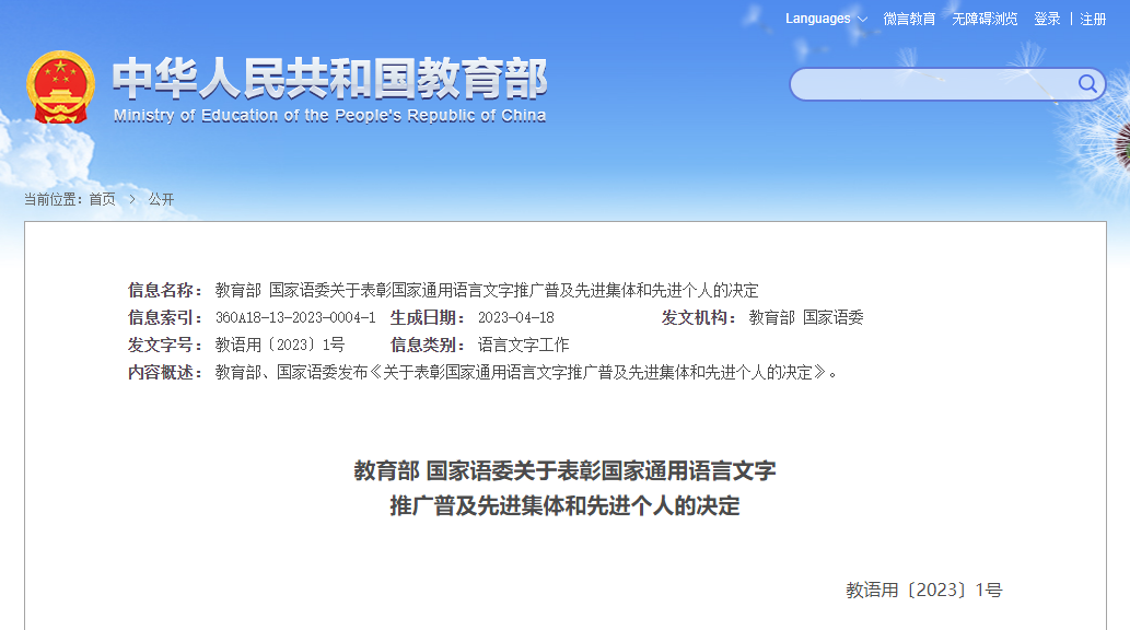 本次表彰活动是《国家通用语言文字法》施行22年来的首次表彰活动。经国务院批准,由教育部、中宣部、国家民委等9部门组成表彰工作领导小组,共评选推荐出178个先进集体和294名先进个人。在5月10日召开的国家通用语言文字推广普及工作表彰大会暨2023年国家语委全体委员会议上,教育部党组书记、部长怀进鹏作视频讲话,教育部党组成员、副部长吴岩出席会议并宣读了《教育部 国家语委关于表彰国家通用语言文字推广普及先进集体和先进个人的决定》。