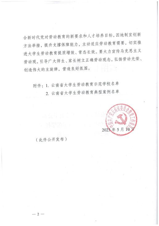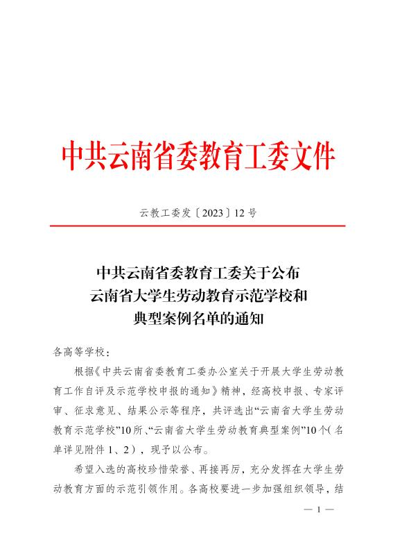 2022年11月至2023年5月,中共云南省委教育工委组织开展云南省大学生劳动教育示范学校评选,从全省81所高校中评选出10所示范学校。近日,中共云南省委教育工委公布云南省大学生劳动教育示范学校名单,8858cc永利唯一官方网成为全省10所示范学校之一。
