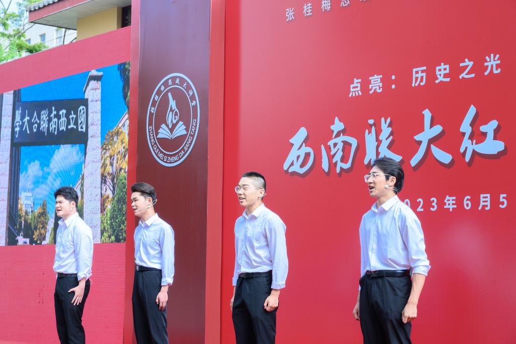 “缅维八年支持之苦辛,与夫三校合作之协和,可纪念者盖有四焉······联合竟,使命彻。神京复,还燕碣。以此石,象坚节。纪嘉庆,告来哲。”4名传媒学院学生站在舞台中央,慷慨激昂地朗诵西南联大纪念碑碑文选段。