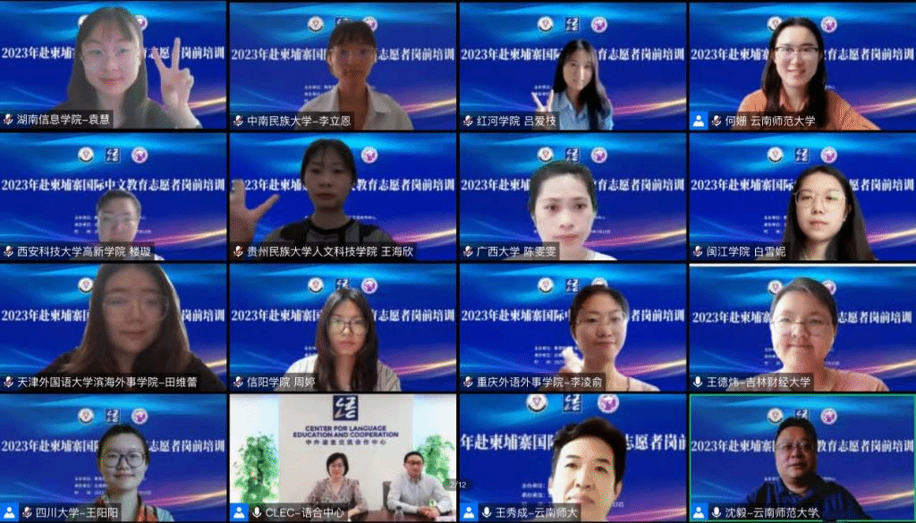 6月8日上午,由教育部中外语言交流合作中心主办的2023年第4期赴柬埔寨国际中文教育志愿者岗前培训在永利官网开班。教育部中外语言交流合作中心志愿者管理处处长周卉致辞,永利官网国际汉语教育学院院长、汉语国际推广师资培训基地(昆明)执行主任王秀成作动员讲话,汉语国际推广师资培训基地(昆明)常务副主任沈毅主持开班,教师代表、工作人员以及来自全国各高校的159名志愿者学员参加了线上开班仪式。