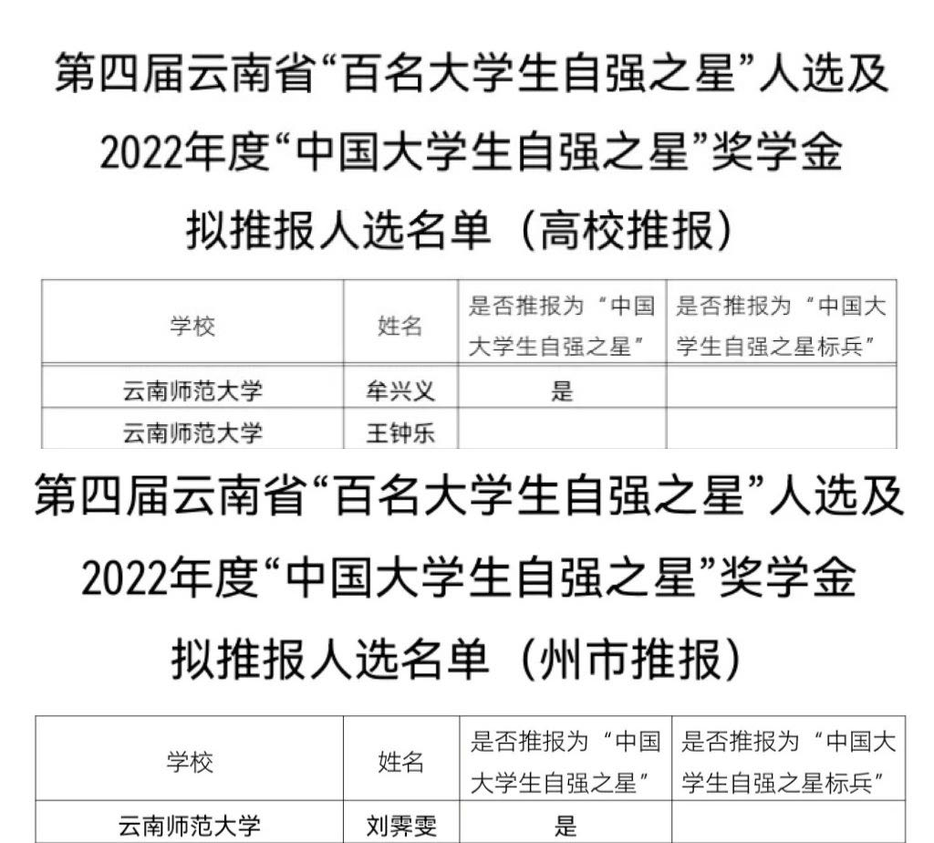 近日,共青团云南省委、云南省学生联合会、云南省青少年发展基金会、华能澜沧江水电股份有限公司联合开展了寻访第四届云南省“百名大学生自强之星”活动。通过前期推报评审,永利官网马克思主义学院牟兴义(高校推荐)、传媒学院王钟乐(高校推荐)、传媒学院刘霁雯(州市推荐)3位同学入选第四届云南省“百名大学生自强之星”,其中牟兴义和刘霁雯2位同学拟推荐参评2022年度“中国大学生自强之星”奖学金。