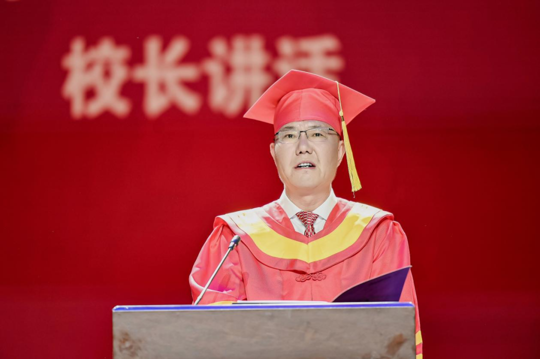 王德强在致辞中代表学校寄语毕业生志存高远、踔厉奋发,做新时代的好青年。一是要志存高远,胸怀天下。将金色的青春年华、个人的理想追求融入中华民族伟大复兴的伟大事业中,为实现中国第二个百年奋斗目标,建成富强、民主、文明、和谐、美丽的社会主义现代化强国而奋斗;二是要立德修身,砥砺品格。正确对待一时的成败得失,在困难和挫折面前谨记西南联大“刚毅坚卓”的校训,历练不怕失败的意志品质,养成乐观向上的人生态度,力求通达通透,把奋斗的汗水洒在祖国大地上;三是要踔厉奋发,自强不息。当今时代,知识更新不断加快,社会分工日益细化,新技术、新模式、新业态层出不穷,既为青年人施展才华、竞展风采提供了广阔舞台,也对青年人提升能力素质提出了新的更高要求。奋斗是青春最亮丽的底色,只有奋斗才能梦想成真;四是要守正创新,勇毅前行。不受视野所限、不被定势所困,不驰于空想、不骛于虚声,始终保持旺盛的求知欲和创造力,保持开放的心态和反思的习惯,将批判精神和创造性思维融入今后的工作和学习中,做合格的社会主义建设者和接班人。