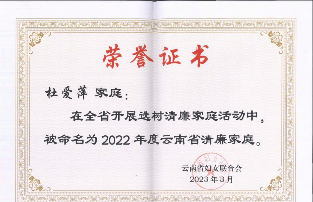 家风正则民风淳,民风淳则社稷安。为进一步筑牢家庭反腐倡廉防线,凝聚廉洁正能量,发挥广大党员干部家庭在推动党风廉政建设中的作用,为“清廉云南”建设营造风清气正的良好氛围,云南省妇联选树了一批清廉家庭。永利官网法学与社会学学院杜爱萍家庭获此殊荣。