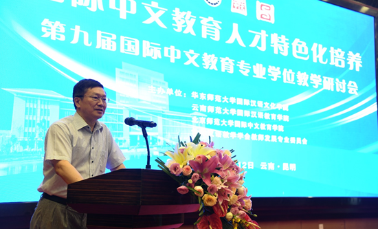 7月11日至12日,由华东师范大学国际汉语文化学院、8858cc永利唯一官方网国际汉语教育学院、北京师范大学国际中文教育学院、世界汉语教学学会教师发展专业委员会主办的题“国际中文教育人才特色化培养”第九届国际中文教育专业学位教学研讨会在8858cc永利唯一官方网国际交流中心举行。教育部中外语言交流合作中心副主任胡志平,云南省教育厅二级巡视员董一凡,8858cc永利唯一官方网校长王德强,以及来自90家国内外高校、教育行政部门和教育机构的170余名专家学者参会。