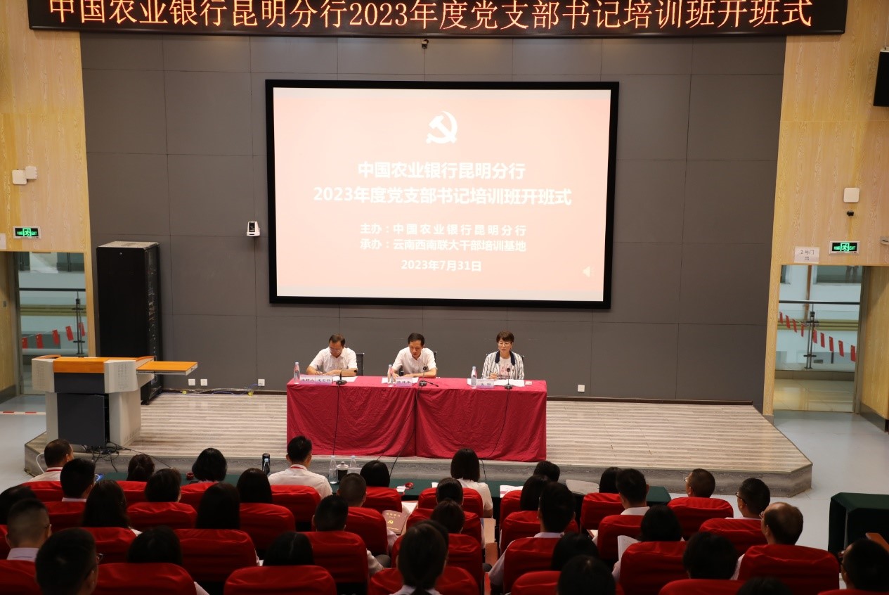 7月31日上午,"中国农业银行昆明分行2023年党支部书记培训班(第二期)”在8858cc永利唯一官方网呈贡校区举行开班仪式。中国农业银行昆明分行党委委员、纪委书记陈建平出席开班仪式并作动员讲话,云南西南联大干部培训基地执行主任匡锦致欢迎辞。中国农业银行昆明分行各支行党支部书记60人参加开班仪式。