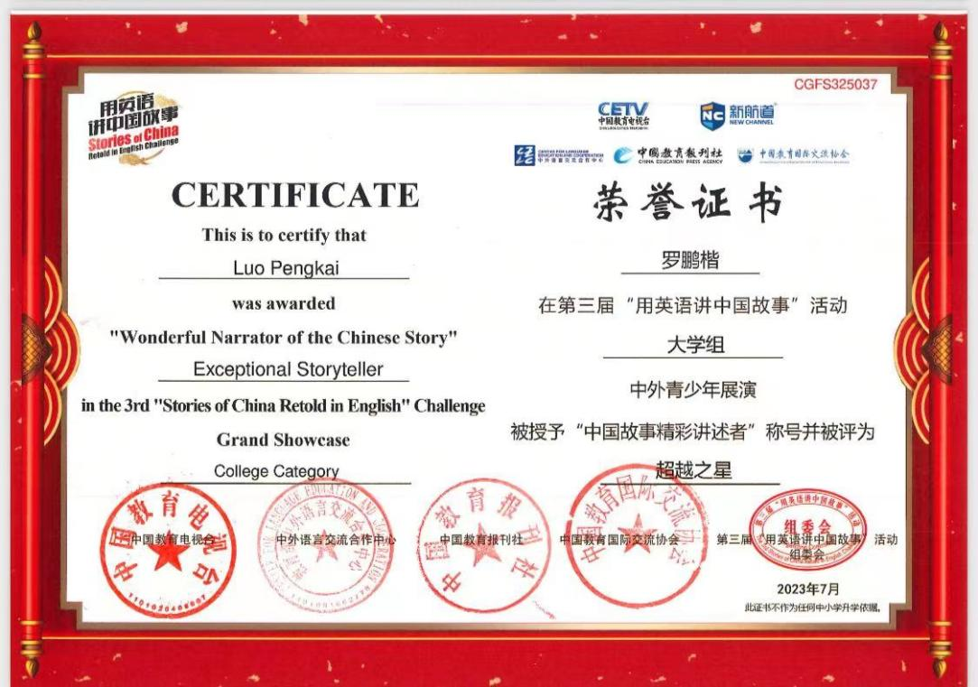 8858cc永利唯一官方网外国语学院罗鹏楷同学在“大学组”比赛中,以第3名的优异成绩荣获“中国故事精彩讲述者”“超越之星”称号,并获得奖金及教育服务基金。