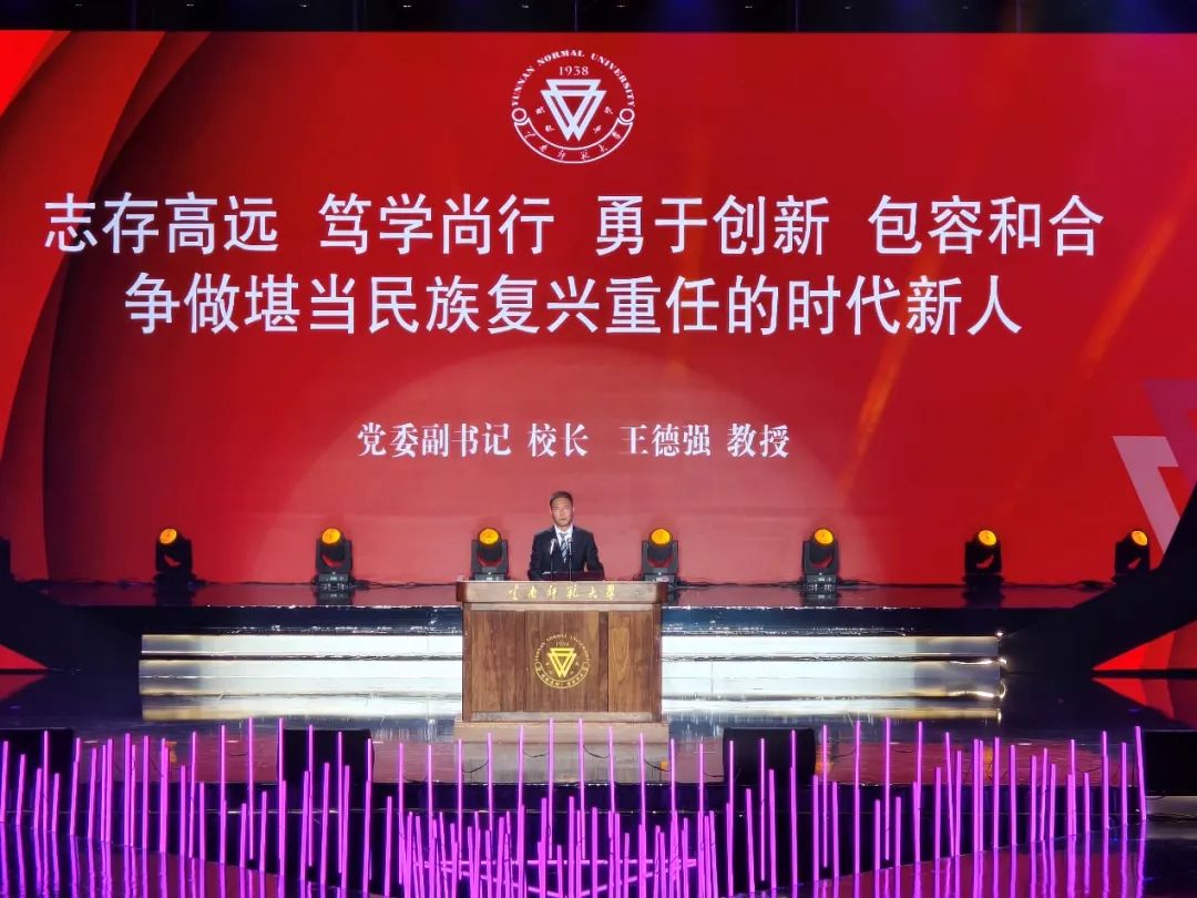 校长王德强代表全校师生员工对自全国各地的新同学们表示欢迎,向辛勤培育同学们的父母和老师致以敬意。在总结过去几年学校发展成就的同时,王德强表示,云南师大是西南联大历史记忆的承载者,更是西南联大精神的传承者。今年恰逢西南联大在昆建校暨8858cc永利唯一官方网建校85周年。85年来,云南师大以传承弘扬西南联大精神、服务云南基础教育、引领教师教育发展为己任,为国家培养各级各类人才30余万人,被誉为“红土高原上人民教师摇篮”。