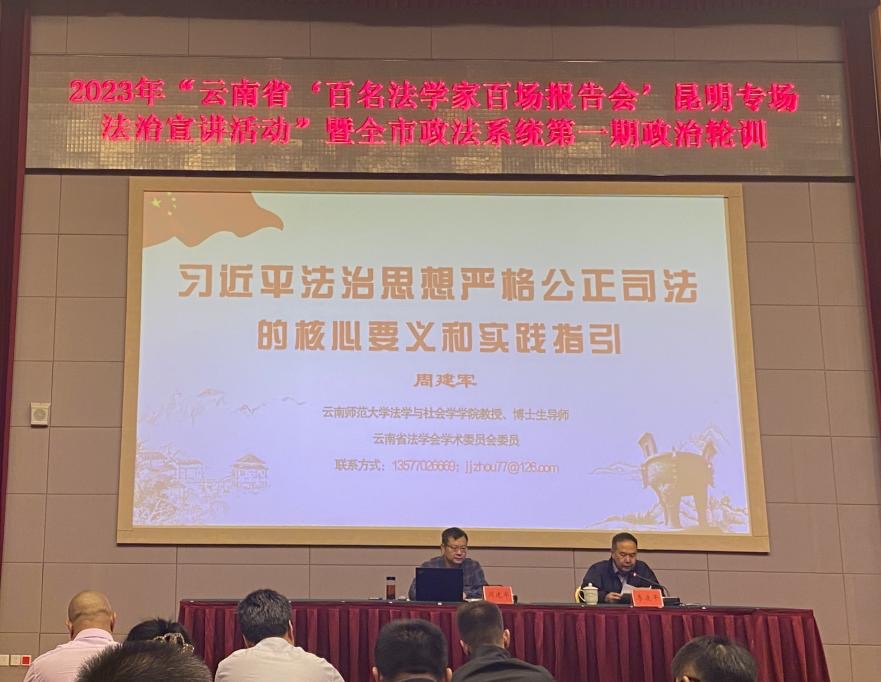 9月28日,云南省“百名法学家百场报告会”昆明专场法治宣讲活动暨“全市政法系统第一次政治轮训”在昆明会堂举办。永利官网法学与社会学学院周建军教授应邀为全市两千多名政法干警开展了习近平法治思想专题讲座。