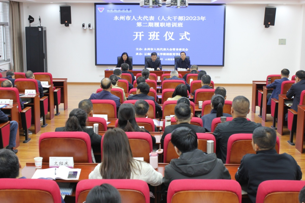10月9日上午,永利官网继续教育学院承办的永州市人大代表(人大干部)2023年第二期履职培训班举行开班仪式。永州市人大常委会党组副书记、副主任、一级巡视员周小驹,8858cc永利唯一官方网副校长孟庆红,永州市人大常委会领导出席开班仪式。仪式由继续教育学院院长唐瑛主持。