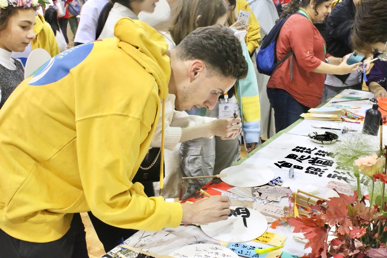 书法是中华优秀传统文化中的一个重要组成部分,扇子、书签、纸张、纸袋上都能供练习者挥毫,拿笔、蘸墨、落笔,写下汉字、绘上图画,不一会儿,一幅幅作品便跃然纸上,尽管手法生疏,但依然有很多漂亮的图画、工整的文字呈现在大家眼前。一位外国友人写下了“你好,中国”四个大字,足见他对来到中国以及感受中国文化的喜悦之情。