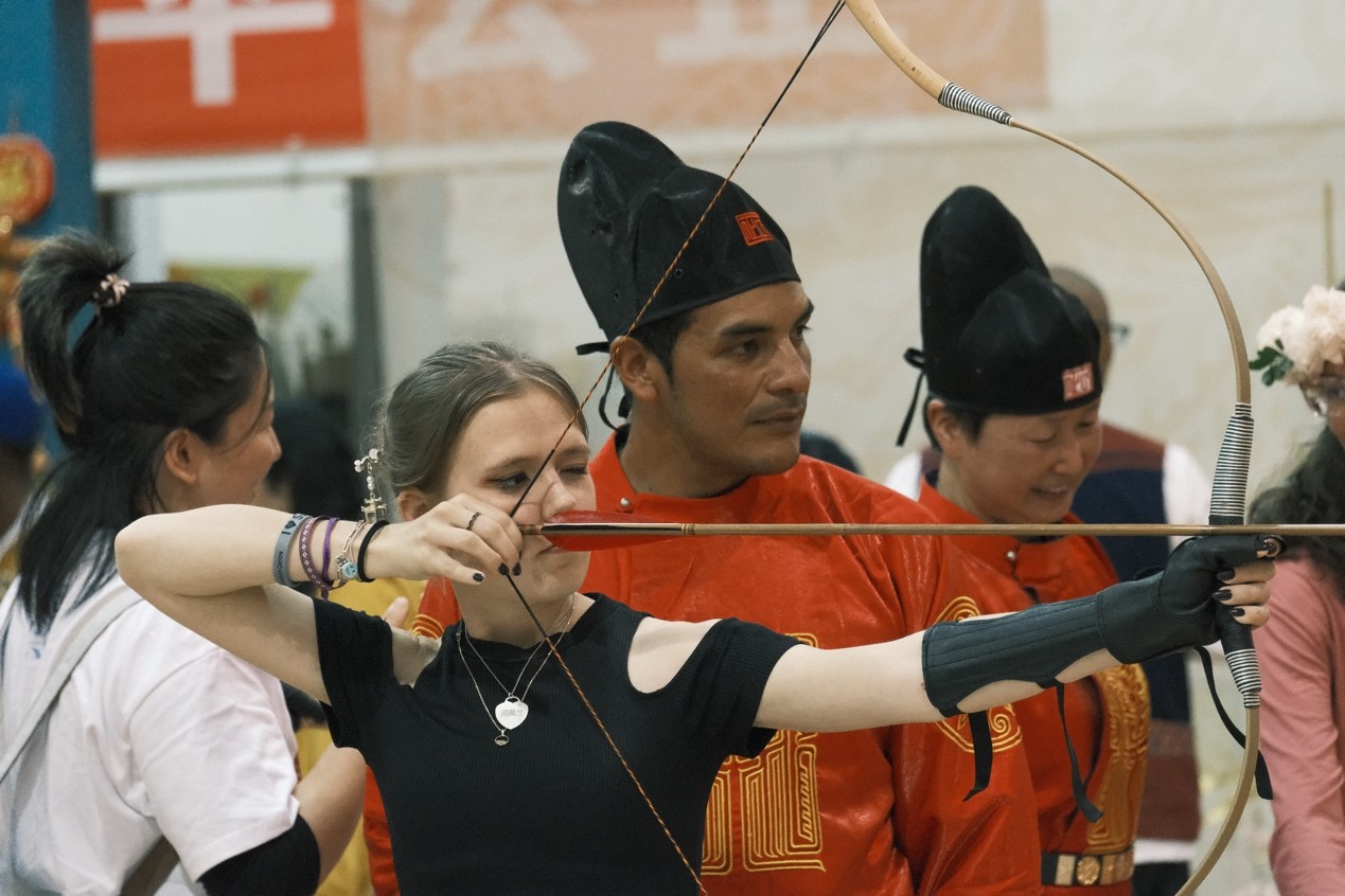 “嘭,嘭,嘭”,箭击中铜锣的声音回响在场地上空,帅气的射箭姿势深深吸引了在场的外国友人。他们纷纷聚集在射艺场地前,在教练的指导下,左手戴上手套和护腕,将箭尾处的凹槽插入箭弦,左手持弓右手拉弦,伸直左手大拇指,将箭放置在虎口处稳定,目光坚定,右手放开箭矢,“嘭”射中了铜锣,引得围观的人发出阵阵喝彩与惊叹。