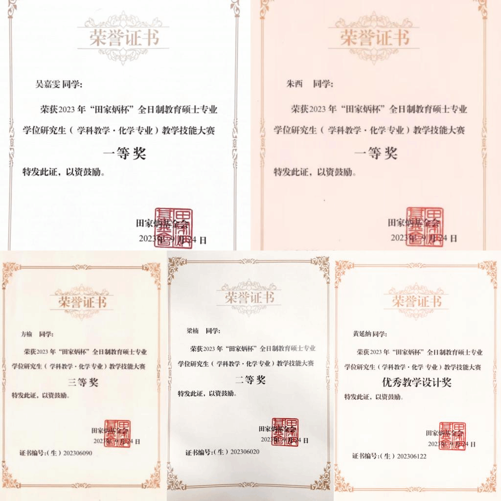 9月24日,2023年全国“田家炳杯”全日制教育硕士专业学位研究生学科教学(化学)专业教学技能大赛决赛在永利官网落下帷幕。经过激烈的比赛,化学化工学院5位参赛选手从180名参赛选手中脱颖而出,朱西、吴嘉雯荣获一等奖,梁楠荣获二等奖,方榆荣获三等奖,黄延纳获优秀教学设计奖。