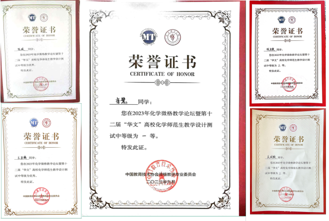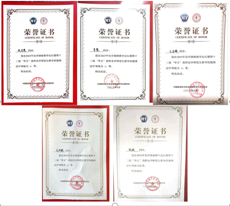 化学微格教学论坛暨第十二届“华文”高校化学师范生教学技能测试与交流展示活动由中国教育技术协会微格教学专业委员会主办,是目前国内教育师范类专业规模最大、参与高校最多的教学技能竞赛展示活动。活动共有来自全国55所院校的287名选手参加,包括教学设计测试和教学技能测试。永利官网6名同学以扎实的专业功底、独特的教学设计、娴熟的授课技能和严谨的答辩能力,最终获得了喜人成绩:在教学设计测试中李慧同学荣获一等奖,张洁奥、吴润颜荣获三等奖,陈琪、王亚梅荣获优秀奖;在教学技能测试中李慧、王亚梅、张洁奥荣获二等奖,吴润颜荣获三等奖,陈琪荣获优秀奖。