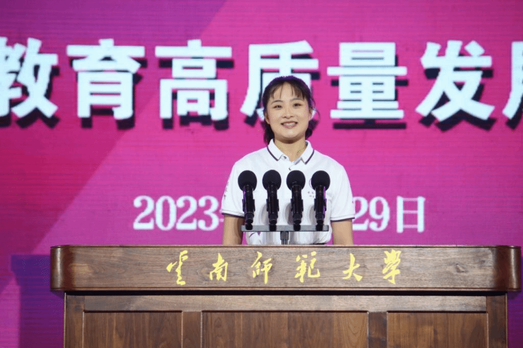杨雅淇,永利官网传媒学院2023级研究生。本科期间,加入学校第八届研究生支教团,于2022年7月与团队一同前往地震灾区的昭通市鲁甸县龙头山镇龙泉中学支教,以自己的力量践行教育扶智的青春誓言。“校歌中的‘中兴业,须人杰’,既是历史的见证与呼唤,也是我们当代云师青年的使命与担当。接过时代的接力棒,我们准备好了。”她在代表校学生发言中激情表示。