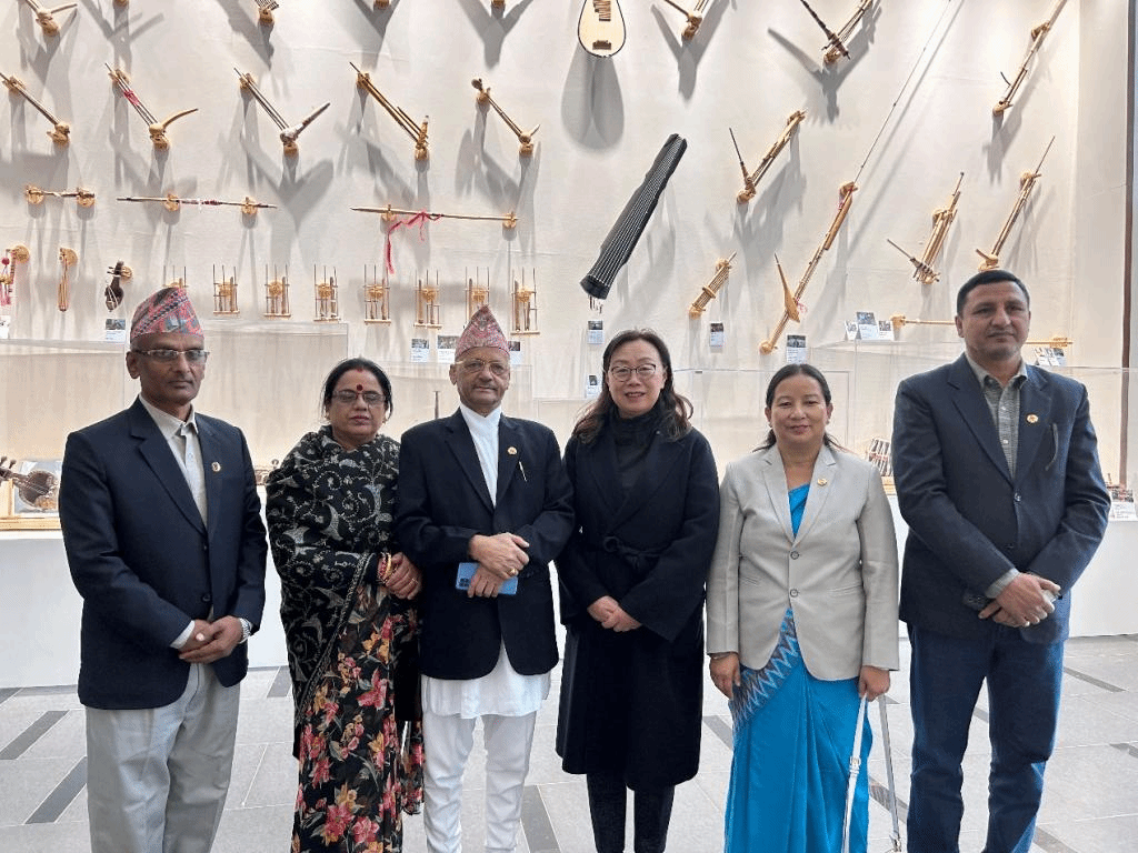 随后代表团一行来到音舞学院中国-南亚东南亚国家非遗音乐舞蹈教育资源数字化陈列馆,参观了馆内陈列的300多件少数民族乐器和200多件南亚东南亚国家特色乐器。当亚达夫·昌达拉·夏尔马了解到陈列馆内馆藏的尼泊尔乐器数量有限,未能形成专门展区后,立即表示回国后将收集一批有尼泊尔特色的民族乐器捐赠给音舞学院,让更多人看到、听到、感受到尼泊尔乐器及传统文化。