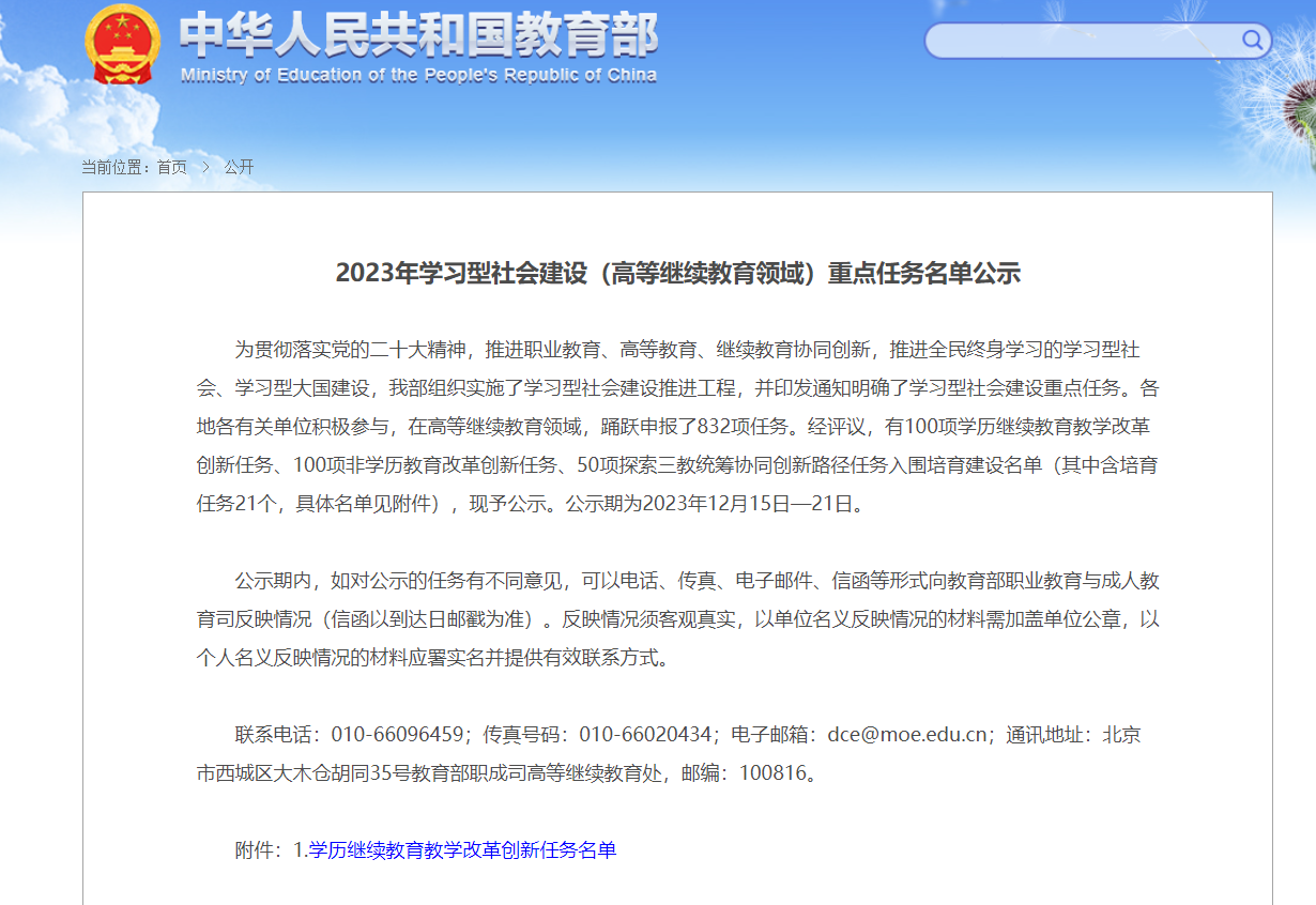 12月15日,教育部公示了2023年学习型社会建设(高等继续教育领域)重点任务名单,由永利官网继续教育学院申报的“数字化赋能边疆区域高等学历继续教育高质量创新发展体系建设”入选学历继续教育教学改革创新任务名单。