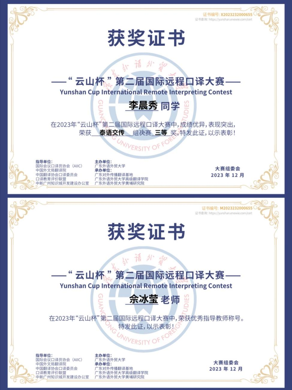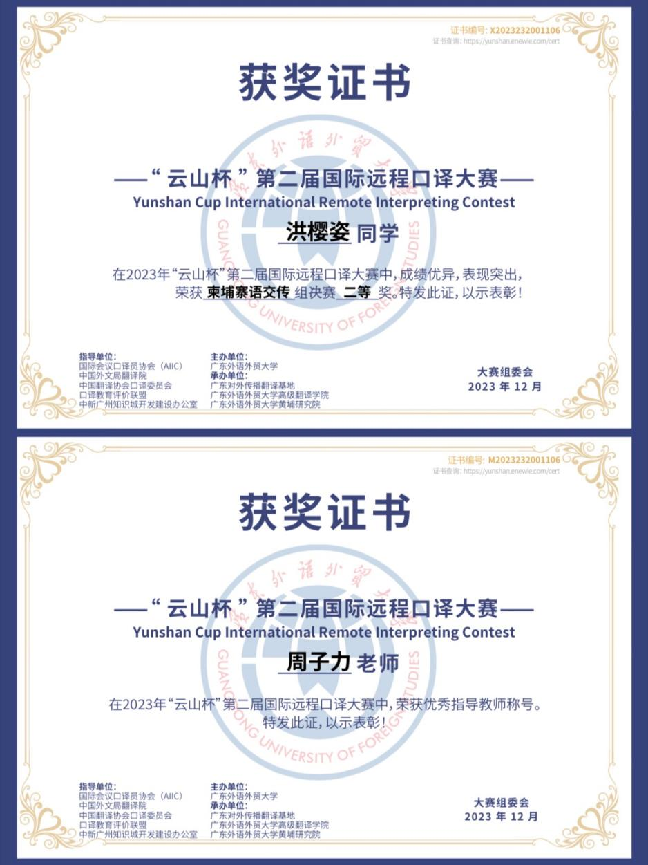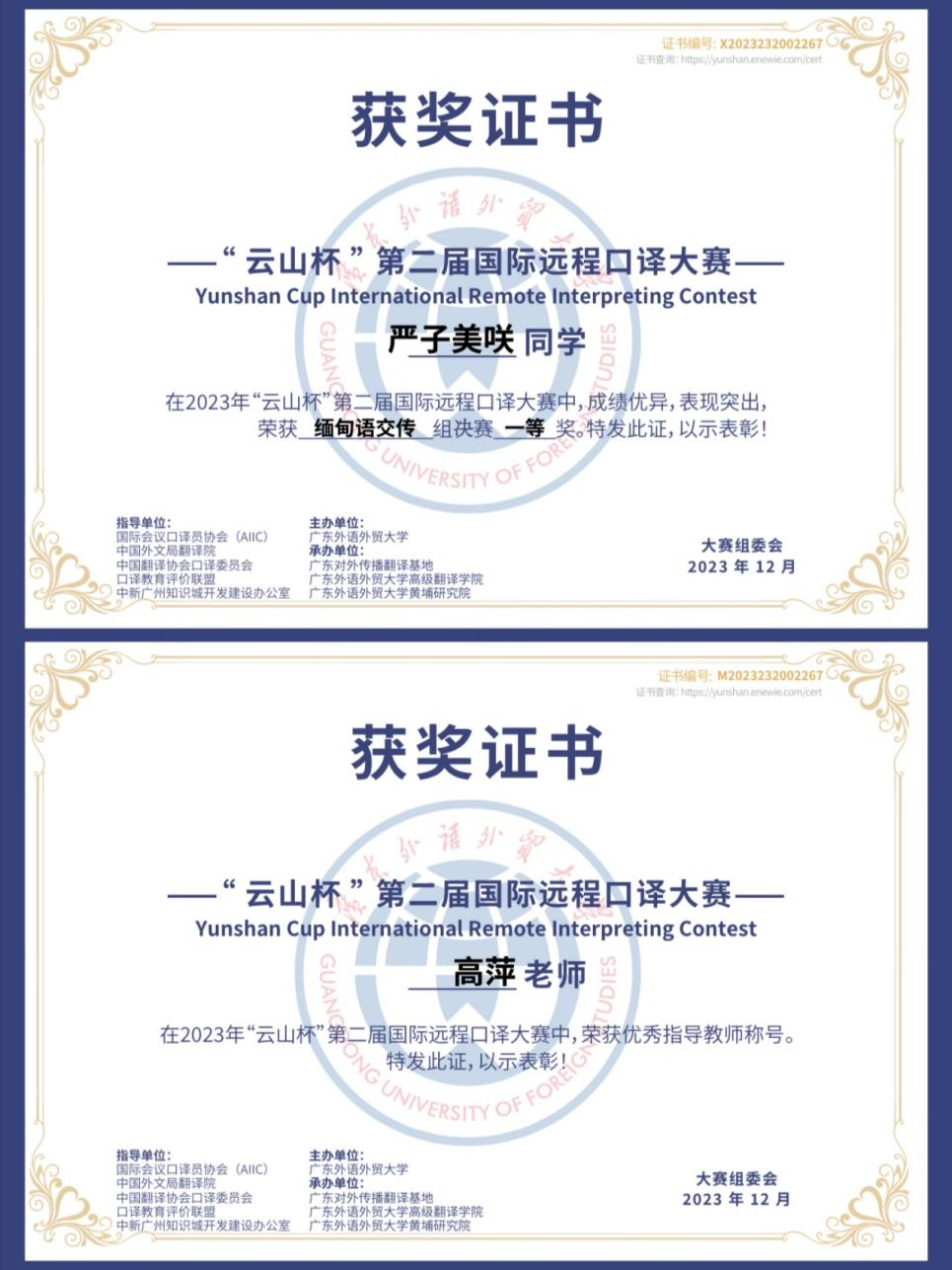 12月17日,第二届“云山杯”国际远程口译大赛总决赛拉开帷幕,共有来自国内外高校的216名选手在远程口译平台上进行高水平竞技。经过初赛、复赛激烈角逐,永利官网共3名学子参加决赛并获佳绩。云南华文学院2020级缅甸语专业学生严子美咲获缅甸语交传组决赛一等奖(全国第二),指导老师为高萍;2020级柬埔寨语专业学生洪樱姿获柬埔寨语交传组决赛二等奖,指导老师为周子力;2020级泰语专业学生李晨秀获泰语交传组决赛三等奖,指导老师为佘冰莹。