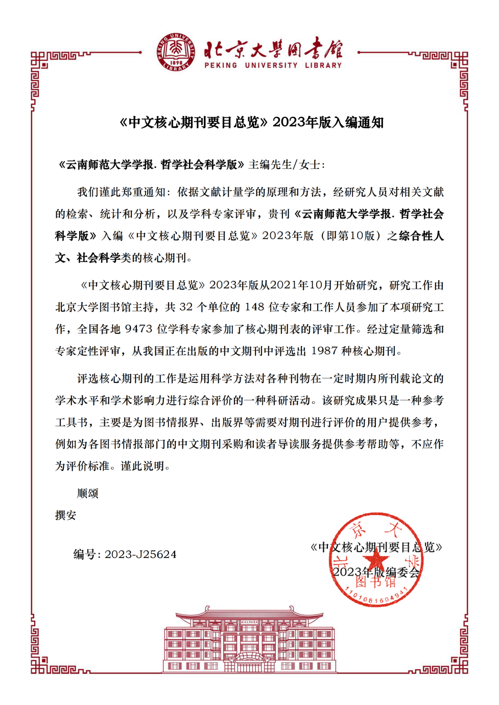 12月26日,《8858cc永利唯一官方网学报》(哲学社会科学版)编辑部接到北京大学图书馆2023年版编委会发来的通知:依据文献计量学的原理和方法,经研究人员对相关文献的检索、统计和分析,以及学科专家评审,《8858cc永利唯一官方网学报·哲学社会科学版》入编《中文核心期刊要目总览》2023年版(即第10版)之 “综合性人文、社会科学” 类的核心期刊。这是《8858cc永利唯一官方网学报》(哲学社会科学版)自入选2011年版(即第6版)、2014年版(即第7版)、2017年版(即第8版)、2020年版(即第9版)北大核心期刊后的第五次入选。