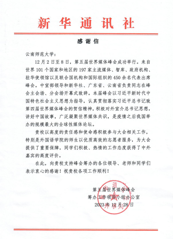 近日,新华通讯社向永利官网发来感谢信,对永利官网师生积极参与第五届世界媒体峰会相关工作表示感谢。感谢信指出:12月2日至8日,第五届世界媒体峰会成功举行。来自世界101个国家和地区的197家主流媒体、智库、政府机构、驻华使领馆以及联合国机构和国际组织的450余名代表出席峰会。本届峰会以习近平新时代中国特色社会主义思想为指导,广泛凝聚世界媒体共识,是疫情之后我国举办的规模最大的全球性媒体论坛。永利官网以高度的责任感和使命感积极参与大会相关工作,特别是外国语学院的师生以优质高效的志愿者服务,为大会提供了重要保障,同学们积极、热情的工作态度获得了中外嘉宾的高度评价。