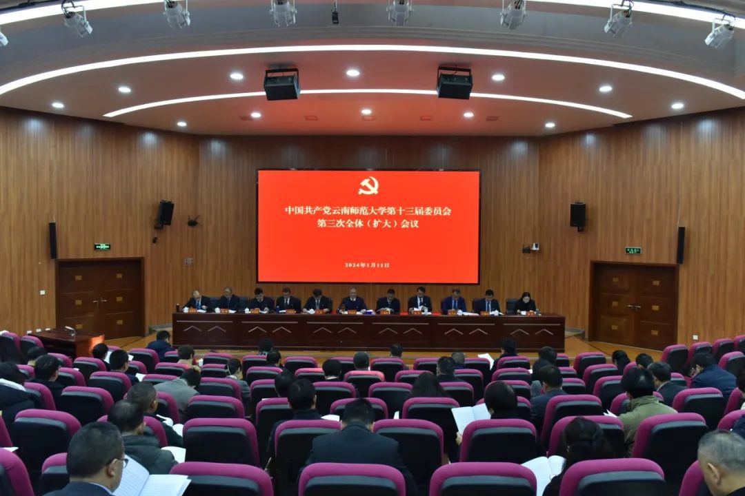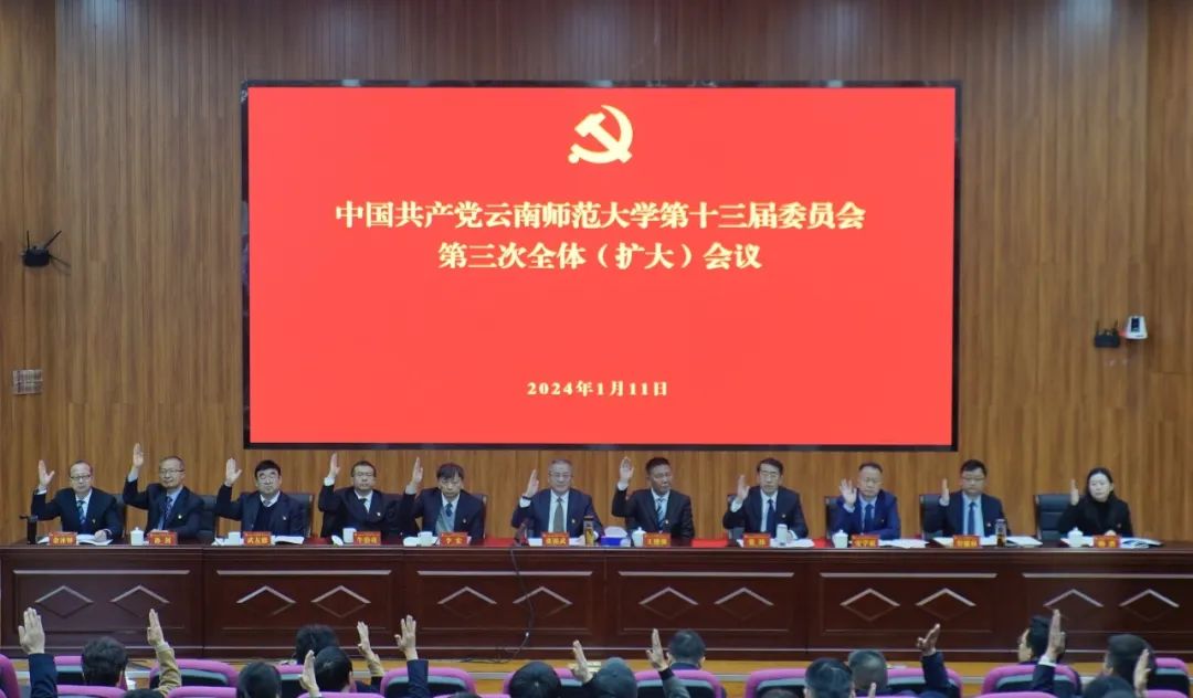 1月11日,中国共产党8858cc永利唯一官方网第十三届委员会第三次全体(扩大)会议在呈贡校区召开。校党委委员出席会议,非党委委员的校领导,校纪委委员,非党委委员的各职能部门主要负责人,非党委委员的各学院(学部)、附属中小学党政主要负责人,学校第十三次党员代表大会部分代表列席会议。