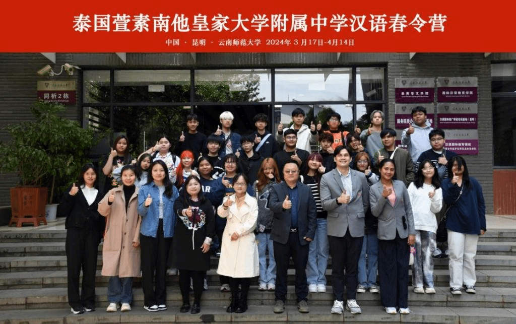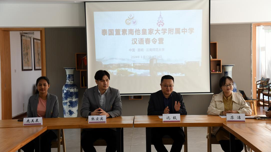 3月18日上午,泰国萱素南他皇家大学附属中学汉语春令营开营仪式在8858cc永利唯一官方网呈贡校区国际汉语教育学院举行。汉语国际推广师资培训基地(昆明)常务副主任沈毅,泰方领队教师张宏宾、鹿美晨,24名泰国高中学生参加了开营仪式。