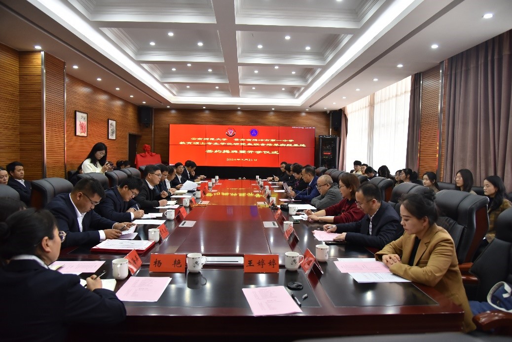 骆华松和段胜能共同签署了《8858cc永利唯一官方网与腾冲市第一中学共建教育硕士专业学位研究生联合培养实践基地协议》。骆华松宣读了《8858cc永利唯一官方网关于遴选腾冲一中邓勇等22人为校外教育硕士专业学位研究生指导教师的通知》,安学斌和周伟共同为腾冲一中受聘导师代表颁发了聘书。最后,与会领导共同为“8858cc永利唯一官方网教育硕士专业学位研究生实习实践基地”揭牌,全体参会教师与教育硕士实习生合影留念。