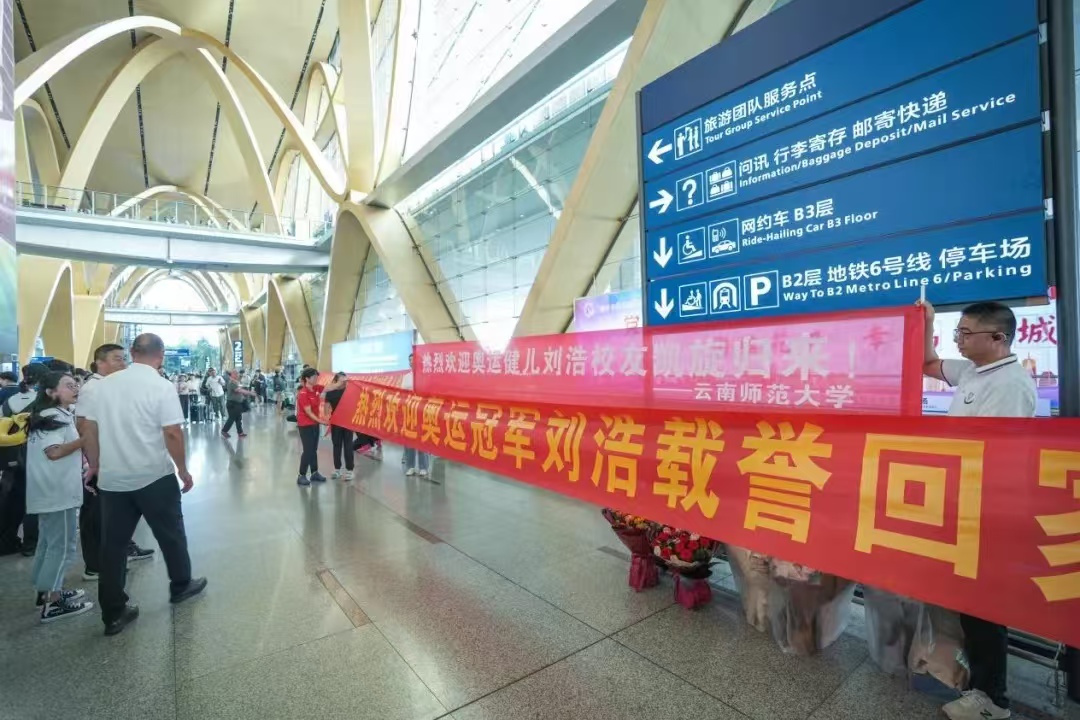 8月15日17时25分,奥运冠军刘浩乘坐的航班降落在昆明长水机场。在航站楼到达口,永利官网师生热切等待刘浩凯旋。17时45分,终于迎来期盼的时刻,当刘浩从出口处走出,接机人群中响起阵阵掌声和欢呼声。“欢迎回家”“辛苦了”……,大家高喊着刘浩的名字,现场气氛十分热烈。永利官网师生举起“热烈欢迎奥运健儿刘浩校友凯旋归来”的横幅,学生代表为他送上精心准备好的鲜花。