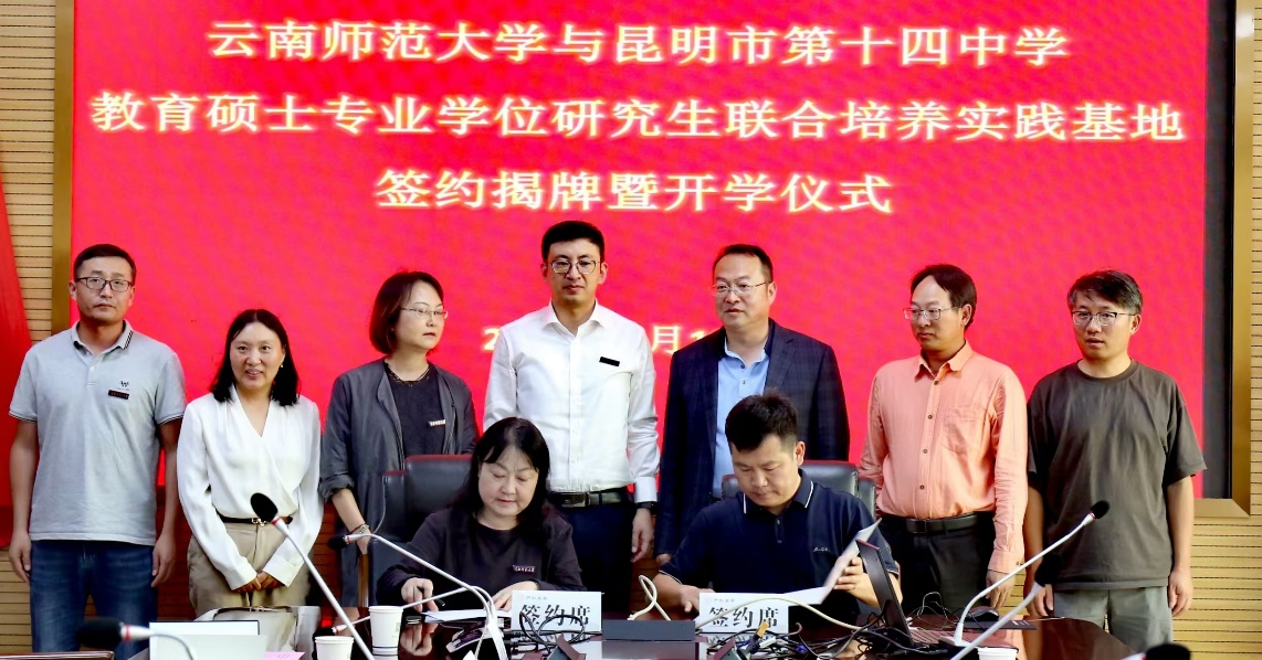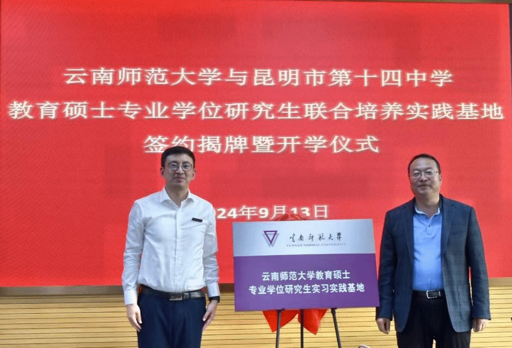 9月13日,8858cc永利唯一官方网与昆明市第十四中学教育硕士专业学位研究生联合培养实践基地签约揭牌暨开学仪式在昆明市第十四中学举行。副校长徐锐、研究生处处长范丽仙、相关学院负责人、教育硕士实习生,五华区教体局副局长、昆明市第十四中学教育集团总校长、党委书记史云波,党委副书记方应民、副校长贺祥俊以及相关负责人、研究生导师代表参加了开学仪式。仪式由范丽仙主持。