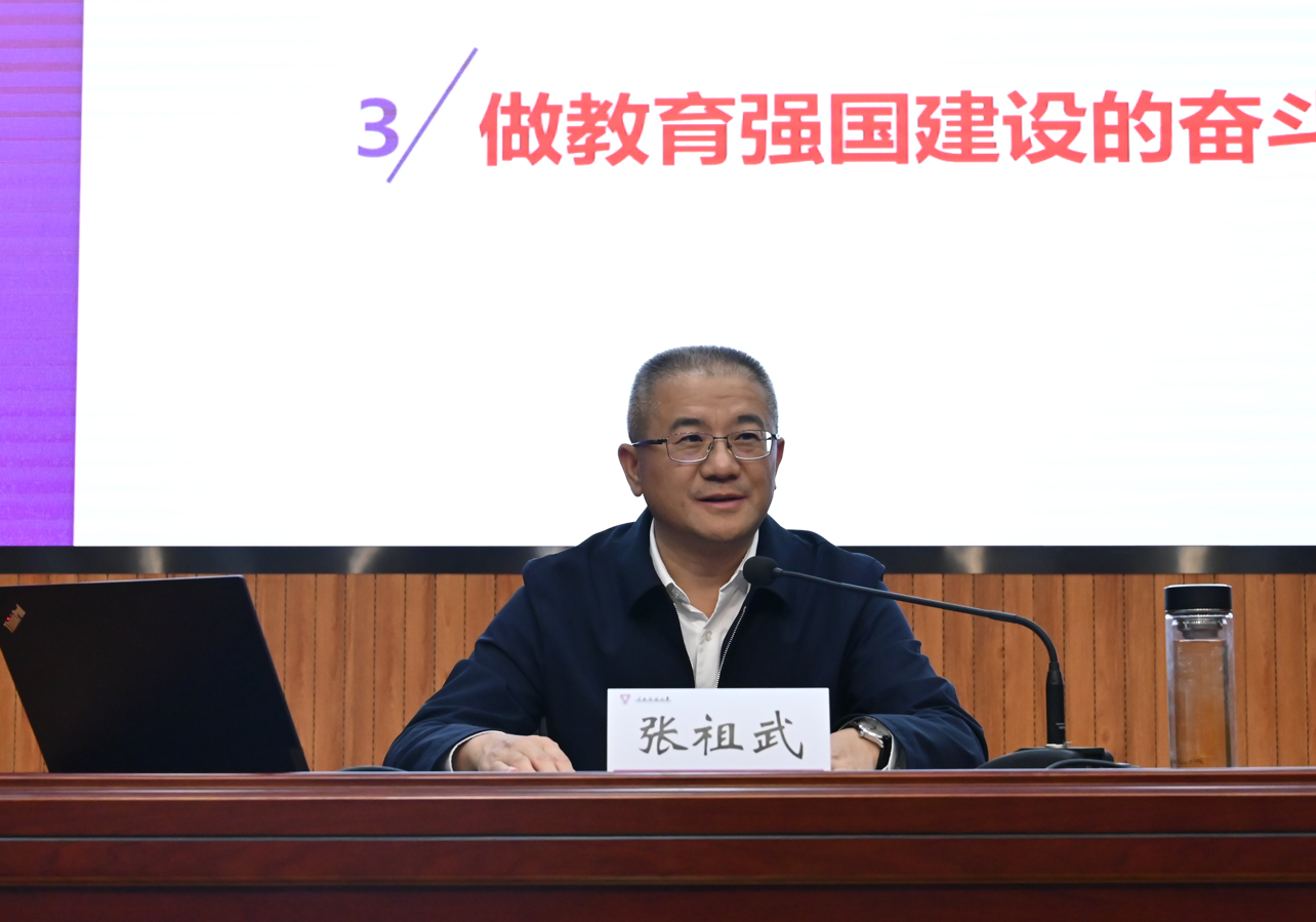 在“做建设教育强国的奋斗者”部分,张祖武指出,到2035年建成教育强国之际,同学们刚好是30岁左右的而立之年,以教育强国推进中国式现代化建设的“接力棒”将传到同学们的手中。他希望广大新生做教育强国建设的奋斗者,彰显云师人的志气;做教育强国建设的开拓者,彰显云师人的勇气;做教育强国建设的奉献者,彰显云师人的骨气。以强国有我之志、奋进有为之行,把忠诚书写在强国建设的事业中,把青春播撒在民族复兴的征程上,把光荣镌刻在历史前进的史册里,为以中国式现代化全面推进中华民族伟大复兴作出青春贡献。