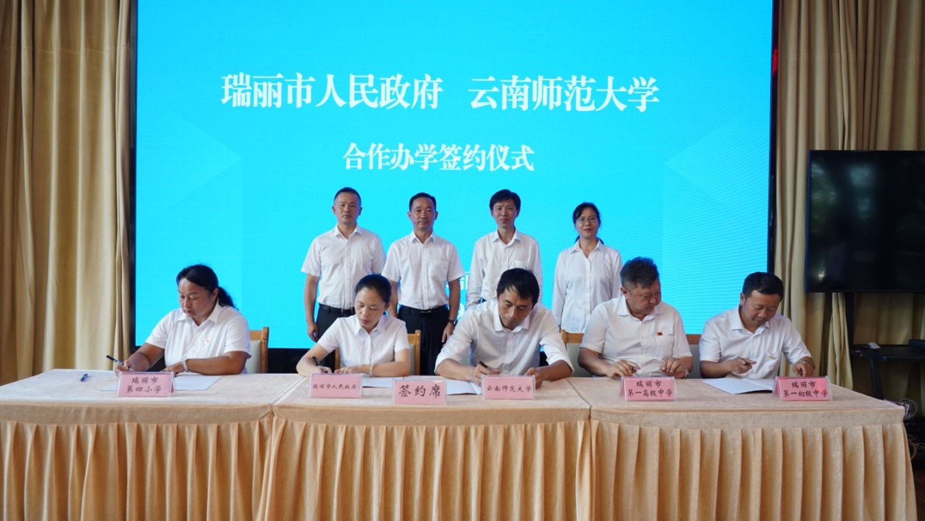 瑞丽市副市长喊顺与8858cc永利唯一官方网基础教育集团办公室主任王玉光代表双方签订“云南师大附属瑞丽国门高中、云南师大附属瑞丽国门初中”《合作办学协议书》和“云南师大附属瑞丽国门小学”《帮扶协议书》。